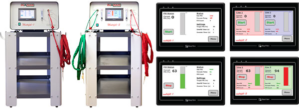 The Multifill-2 is a dual line version of the Multifill-1. The Multifill range has been designed to operate with all the inert gases and mixtures used in the insulated glass market with both lines using the two hole filling method. The Multifill-2 has the ability to gas fill with two different gases at the same time. Each line has a variable flow control between 1-15 litres a minute. This allows the customer to gas fill with Argon at the higher flow rate to maximise filling times. The flow rate can then be reduced when using Krypton/ Xenon and mixed gases to minimise wastage of the more expensive gas. Alternatively both lines can be used to fill a Triple insulated glass unit with a different gas in each cavity.